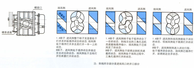1.螺旋形狀是20℃以上的固定螺旋方式。機殼的進排風屏蔽線切入螺旋,以轉(zhuǎn)子頂端光面線構(gòu)成的三角形進排風口,通過轉(zhuǎn)子的旋轉(zhuǎn)而循序打開。本風機的進排風口,不象舊式羅茨螺旋風機那樣在瞬間打開或關(guān)閉,所以運轉(zhuǎn)聲音極小,幾乎沒有排風脈動。