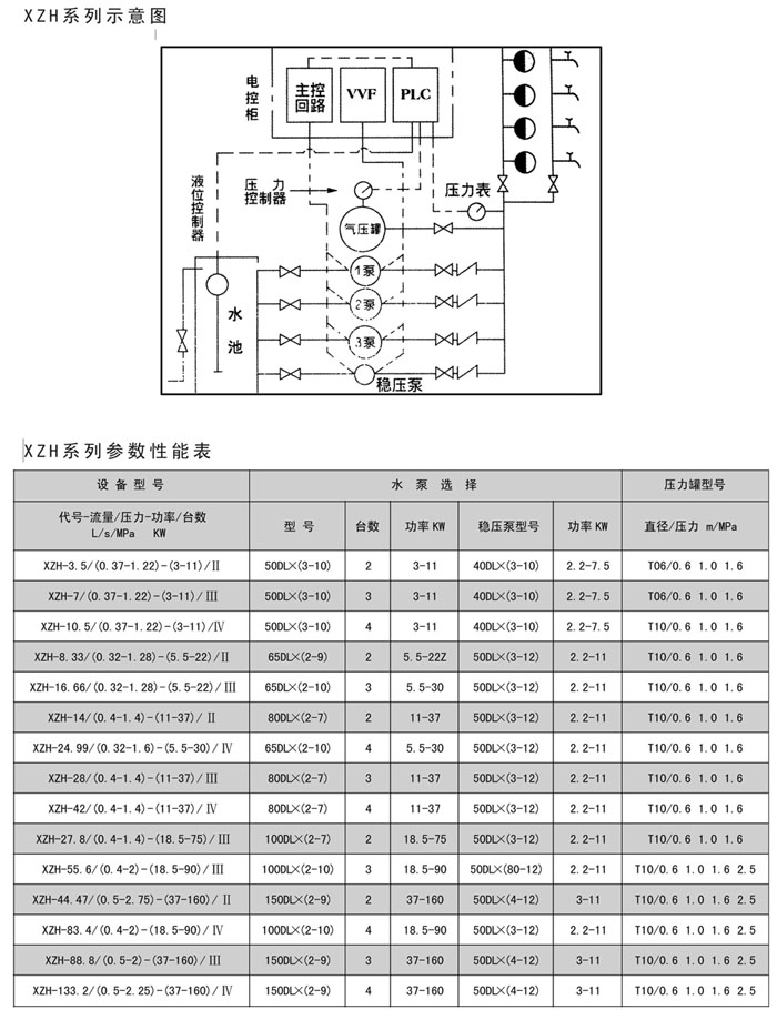 對于帶氣壓罐XZH型給水設備,可實現正常用水量時由消防泵定時輪換、恒壓變量供水,夜間小流量時,由氣壓罐保持管網壓力。由于氣壓罐具有一定的消防貯水量,故更適于消防栓和自動控制噴灑滅火系統。