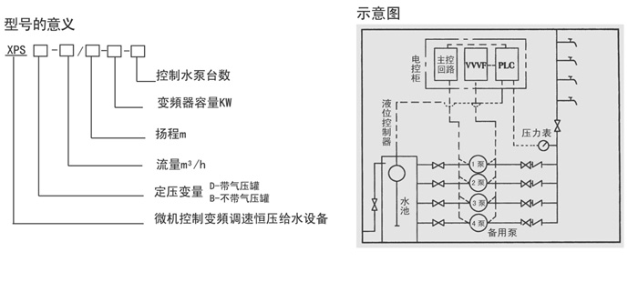 該設(shè)備由水泵機(jī)組、電控系統(tǒng)、壓力儀表、閥門管路及共同底座等組成。其中電控系統(tǒng)由變頻調(diào)速器,可編程序控制器、壓力設(shè)定器(專用PID)及低壓電器線路等組成。(見示意圖)