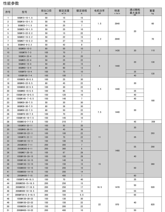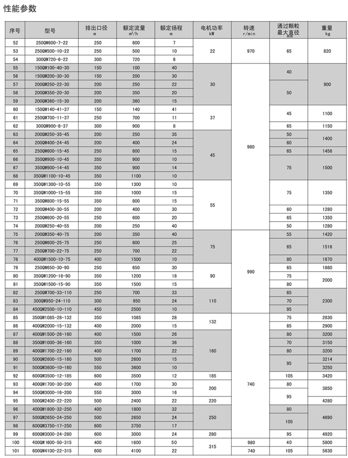 該系列泵排出水口徑為50—600mm,流量10~7000m3/h,揚程為5~60m, 功率為1.5~315KW,通過固體顆粒直徑為20~145mm。
